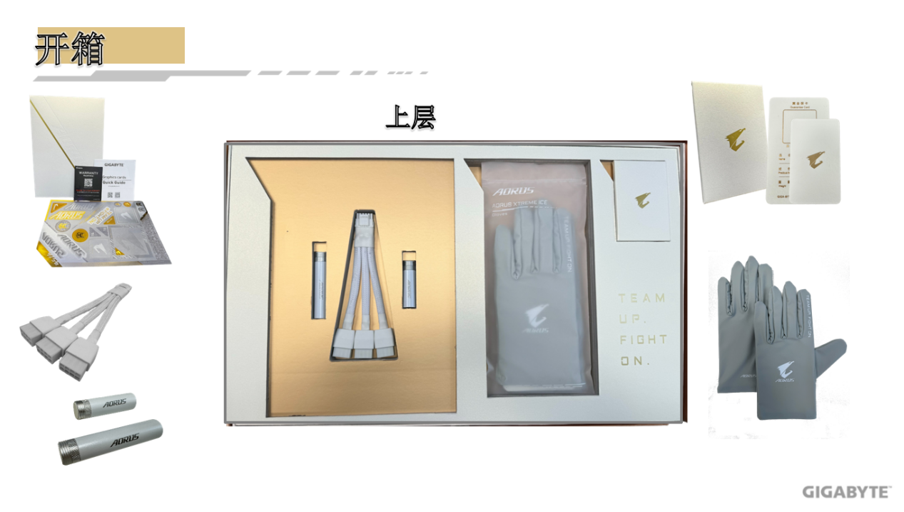 这次在产品里还有一个隐藏彩蛋、,就是随产品附赠有专属的配件,有独立的工具箱包装,内含了定制的显卡支架、转接线、AORUS黄金保证卡与贴纸、防静电手套等。附件箱的开箱和设计同样遵循了钛金雕的设计理念,布置精细且富有仪式感,让人感到惊艳。
