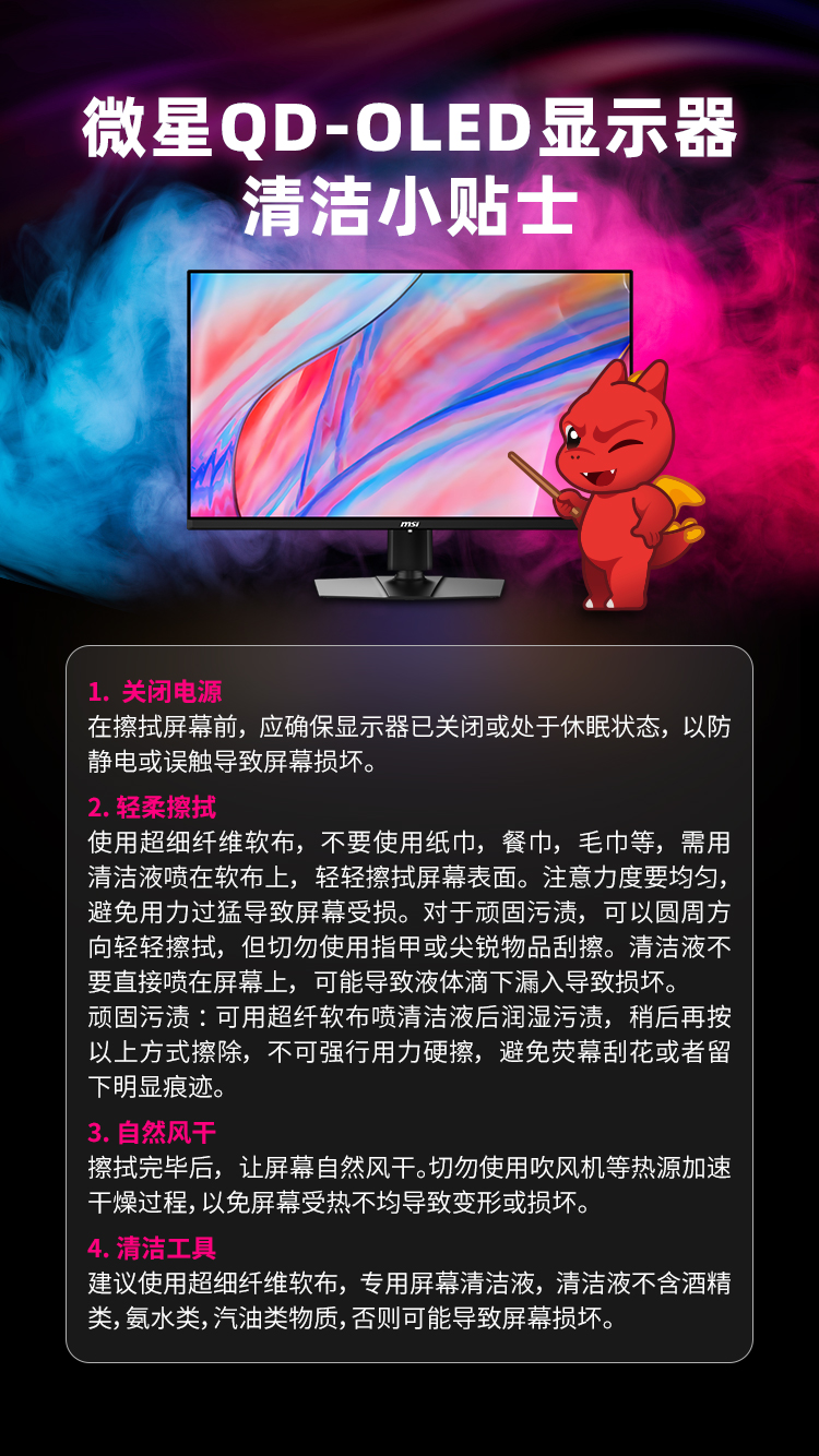 近两年,OLED显示器凭借更好的显示效果和使用体验,走入大家视线,但很多用户反馈不知道OLED显示器如何清洁才是正确的操作模式。为此QD-OLED显示器专业品牌MSI微星科技近期发布了一系列针对其下QD-OLED显示器的清洁小贴士,旨在帮助用户更好地维护显示器,延长使用寿命,配上微星针对其QD-OLED系列显示器推出全面的三年烧屏保修服务,将更好的进一步提升消费者体验。
