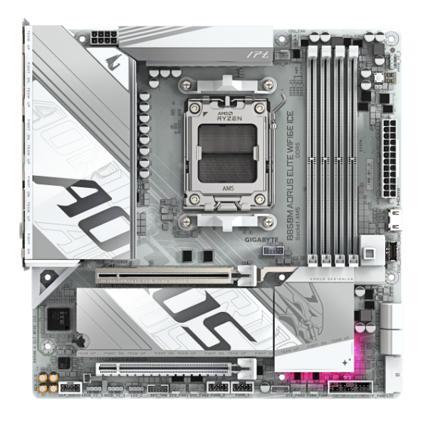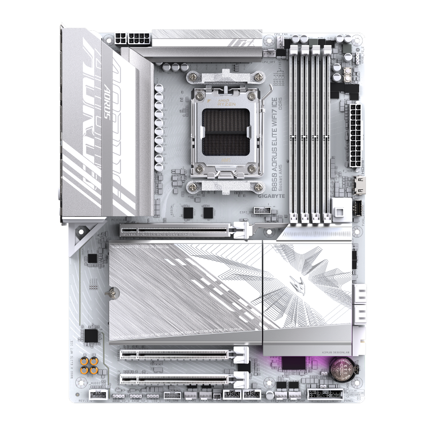 此次技嘉B850共推出2款ATX版型主板,分别为B850 AORUS ELITE WIFI7 ICE(技嘉B850冰雕)、B850 AORUS ELITE WIF7(技嘉B850小雕),这两款主板均配备了14+2+2相供电设计,供电相当强大。最为津津乐道的就是技嘉B850 冰雕的外观了,采用了与X870冰雕几乎一致的设计语言,为了强调纯白主题,技嘉在一些细节上做得很到位,4条内存插槽、PCIe 5.0扩展插槽、M.2 散热装甲以及CPU主板供电接口等一切能够在主板正面看到的接口,全都做成了白色,甚至原装的散热底座也都是由白色工程塑料制成,颜值极高。